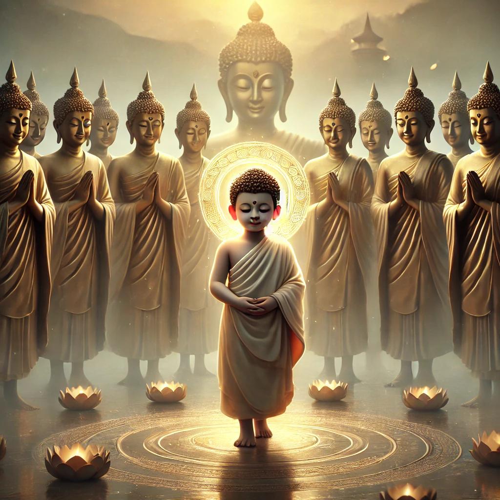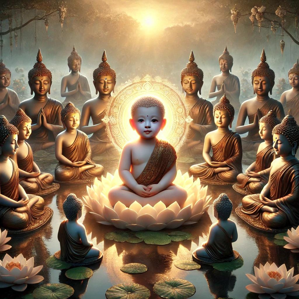 他的身形娇小,脸庞如孩童般清澈无暇,眉宇间却透着超越时空的智慧。他的双眼微微睁开,映照着天地万物,仿佛知晓一切,却不言一语。他脚下的莲花随着他的步伐缓缓绽放,光辉层层递进,如同波纹荡漾,将整个世界映照得更加神圣。