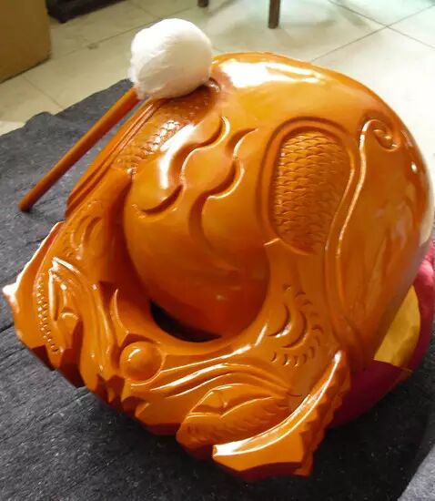 那时大家就愣在那边,有一个老和尚看见了就跟大家说:这一只鱼你们吃不得,它为了救这个孝顺的小孩子,牺牲自己的生命是大菩萨。大家一听,不敢吃了,就把这只龙鱼送给了老和尚。这个老和尚拿到佛寺做成标本,每天看。所以我们现在做成木鱼,把肚子挖开,敲它肚子听声音,大慈悲的声音,牺牲自己的生命,来帮助 这个孝顺的小孩子。所以敲木鱼代表什么?消灭嗔恨心、残忍心,开发慈悲心。打法器就是我们愿意奉献自己的生命给众生。