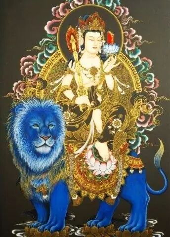 文殊菩萨表大智,坐骑是一头青色狮子。文殊菩萨的形象,通常是手持慧剑,骑乘狮子,比喻以智慧利剑斩断烦恼,以狮吼威风震慑魔怨。文殊、普贤共为一切菩萨之上首,同为毗卢遮那佛之胁士,合称为“华严三圣”。