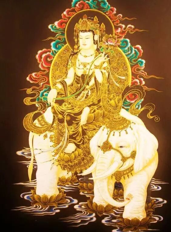 普贤菩萨表大行,坐骑是六牙白象。白象代表愿行殷深,辛勤不倦;六牙表示六波罗蜜──布施、持戒、忍辱、精进、禅定、慧智。象征“愿行广大,功德圆满”。