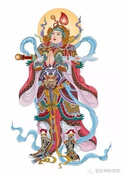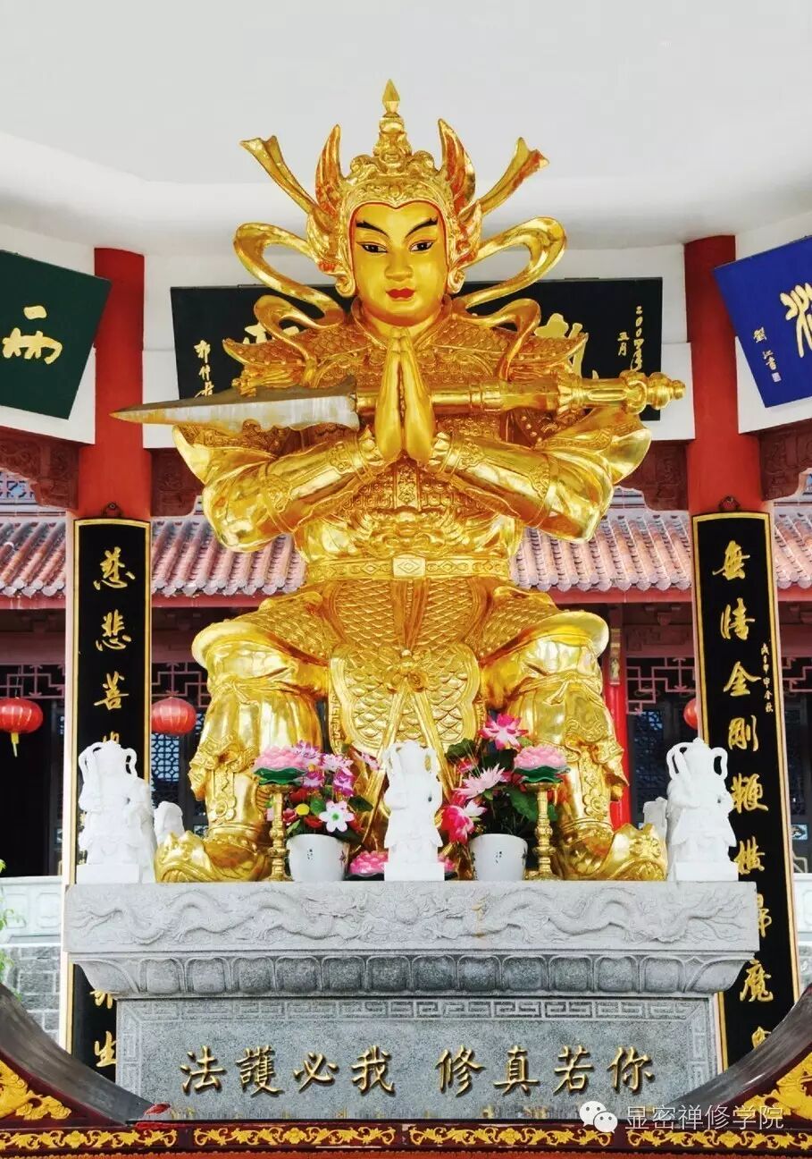 韦陀菩萨背对弥勒佛,面向大雄宝殿,降魔伏鬼,保护佛法。 《大藏经》记载韦陀菩萨生于农历六月初三日,常在娑婆世界,拥三洲大法轮,一十八世为将军身,五十四世为宰相,造亭接众一百二十所,开井一百三十口,造僧袈裟及碧树钵八百万,设僧尼浴池,砌大路四十八条,造佛寺四十六所。每世造旃(zhān)檀香佛一千尊,高丈六尺,每尊佛前造金宝塔一座,各高七尺;每世造《大藏经》一百藏。一十七世为真童身。宝华琉璃佛会上成道,号普眼菩萨;释迦佛会上,名真童身菩萨。手持金刚宝杵重八万四千斤,金刚不坏身,发大誓愿,佛佛出世拥护佛法。头戴凤翅兜鍪(móu)盔。足穿乌云皂履,身披黄锁子甲。若人发愿造印图文一张,乃至千万张,无病延年,菩提心不退,功德无量。