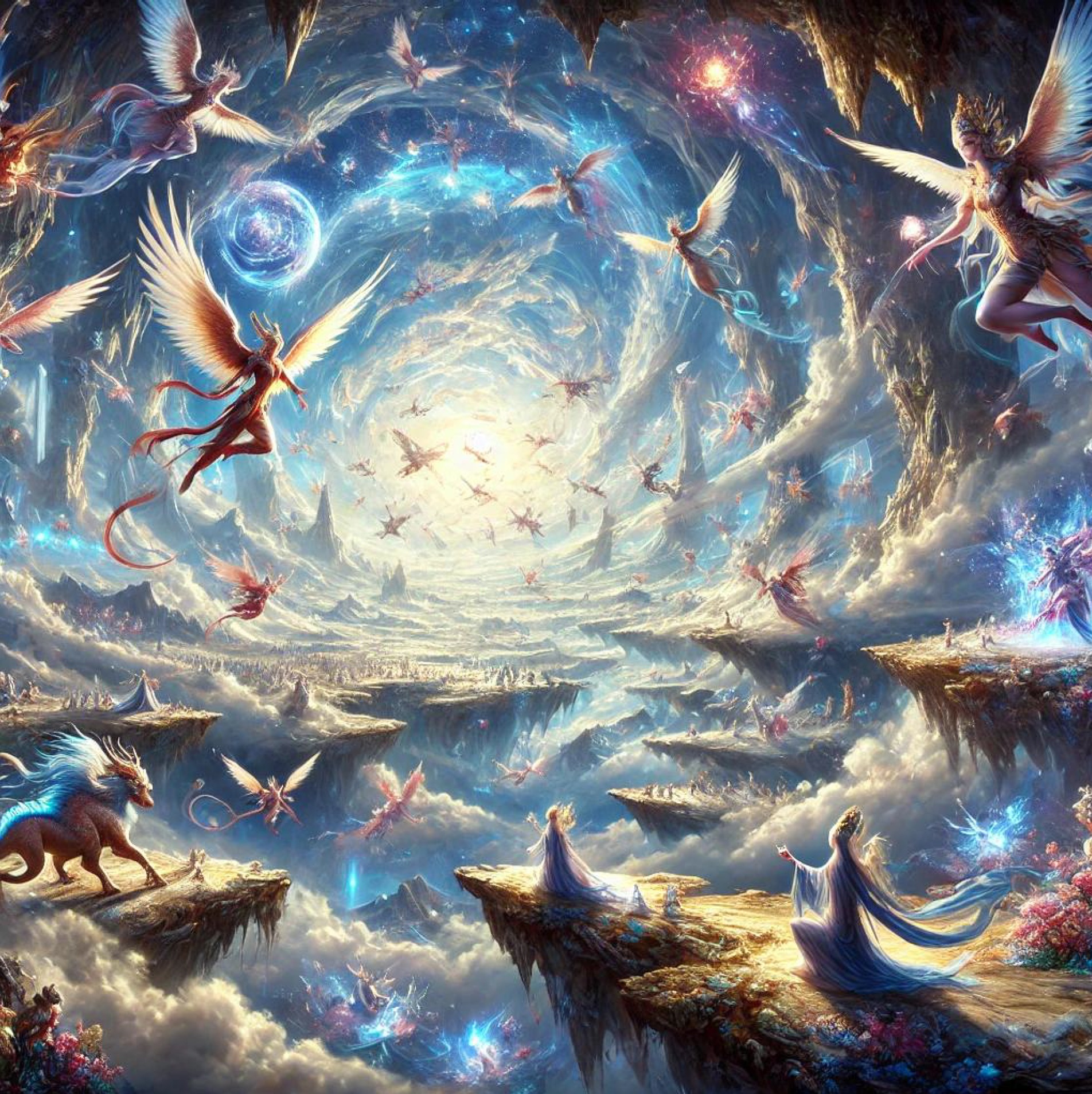 我信步走出殿堂,登高远望,目之所及,乃一方无垠广阔、恢宏璀璨的幻境。苍穹湛蓝,星云缭绕,金碧辉煌的宫阙与绚烂的天地融为一体,绮丽如梦,如诗如幻,令人沉醉其中,仿若步入神话之境。
