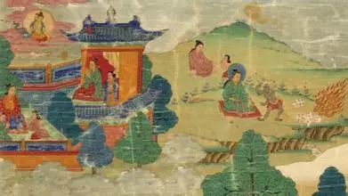 佛传图是绘画释迦牟尼佛一生教化事迹的图。可以多幅连续表其一生,或选画其中某一事迹,如说法图之类。释迦牟尼佛一生重要事迹,一般称为八相成道。对此有大小乘两种不同说法,大乘的说法:一是从兜率天降,二是白象入胎,三是住胎说法,四是右胁降生,五是逾城出家,六是树下成道,七是初转法轮,八是双林入灭;小乘的说法是没有住胎说法一相,而在出家之后、成道之前加降伏魔军一相。在我国西藏又有十二相成道之说:一、从人间上生兜率天,二、从兜率天降生,三、入胎,四、出胎,五、善巧诸技艺,六、受用诸妃眷(五、六是赞美太子在宫中的生活,文学武功都最精巧,享尽富乐),七、出家,八、修苦行,九、降魔,十、成道,十一、转法轮,十二、入涅槃。以上所叙成道相是属于成佛以前的相较多,属于成佛以后的相较少。