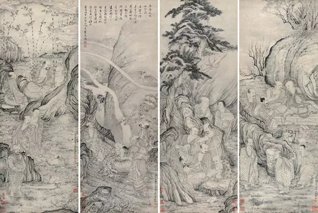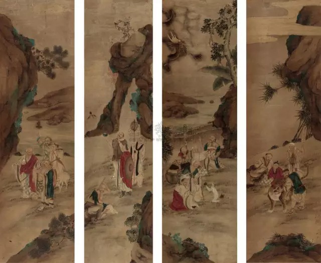 根据佛教历史中所记载的故事,绘画成图,叫作故事图。中国佛教史的故事,首先是:摄摩腾取经图,石勒礼佛图澄图,也叫作石勒问道图,也叫作蕃王礼佛图,这是古人常画的;关于东晋时佛教故事有:支(遁)许(询)间旷图、支遁三隽图、慧远虎溪三笑图、东林莲社图,生公说法图等;关于南北朝的佛教故事有:梁武帝翻经圆、梁武帝与志公论法图、达磨渡江图、达磨面壁图、二祖调心图;关于隋唐的佛教故事有:隋文帝入佛堂图、唐玄奘取经图、五祖授衣图、庞居士图、丹霞访庞居士图、昌黎见大颠图、李翱访药山图、圆泽三生图、丰干与寒山拾得天合说问图;宋代的佛教故事图有:赞宁谱竹图、东坡留玉带图等;此外还有画家遣兴之作,加元赵孟頫的写经换茶图、明孙克弘的听经鸡图、刘廷美的上方游览图、赴璞的石梁飞锡图等,都是描绘当时的故事。