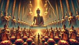 众多佛陀静静跟随在他的身旁,低垂目光,护送着他向前行走。他们神情肃穆,步伐坚定,仿佛正在见证一场亘古未有的觉醒。