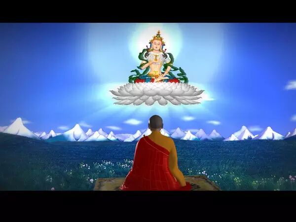 離開龍宮,繼續前行,有一匹高大黃色的騾馬向我迎面奔馳而來,我跪地磕頭禮拜,一把長柄彎刀,將我低著的頭抬起,此刀可是要再次測試無我的決心?我雙手合十等待刀起頭落的考驗時,聽到吉祥天母對我說“眾生平等”,對每一位眾生都要生恭敬心,不起傲慢心,分別心,敬畏生命,善待萬物。 說後吉祥天母尊者他騎著馬威風揚長而去。