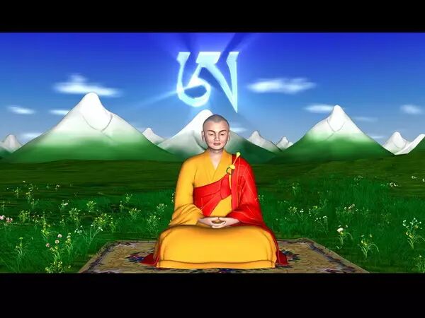 他的身形娇小,脸庞如孩童般清澈无暇,眉宇间却透着超越时空的智慧。他的双眼微微睁开,映照着天地万物,仿佛知晓一切,却不言一语。他脚下的莲花随着他的步伐缓缓绽放,光辉层层递进,如同波纹荡漾,将整个世界映照得更加神圣。