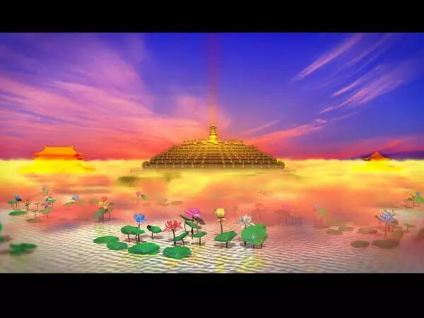 我張大眼睛拼命使勁去瞧!瞧不見任何影像,趕緊跪拜祈請上師佛菩薩,空行諸尊加持,使我能澄淨意中觀明然,一片祥光揭開天幕,頓時看到經中說的,如來含笑放百千萬億光明雲,大吉祥光明雲,大般若光明雲,大慈悲光明雲,大讚歎光明雲,等等天空上雲朵皆放光,不僅如此,山、川、河、海、皆放光,連宮殿屋舍也放出吉祥光芒,心想放光的世界海!佛光普照,光明燦爛,真是墨難以形容,太莊嚴了。
